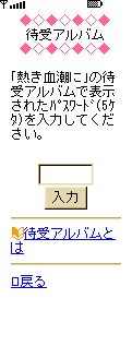 | 2. | 『ケイタイクラブ』にアクセスをします。メニュー「熱き血潮に連動コンテンツ」→「待受アルバム」の順で選択します。 | ||||
