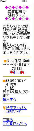 | 1. | 『ケイタイクラブ』にアクセスをします。メニューの「熱き血潮に連動コンテンツ」→「花組百貨店」→「熱き血潮に連動商品」の順で選択します。 | ||