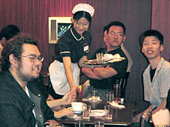 2003年7月18日(金)、待ちに待った「太正浪漫堂 池袋本店」リニューアル&「Sakura Cafe」オープン記念セレモニーが朝10時より、池袋ギーゴ7階で行われました。 いよいよ全貌が明らかとなった「Sakura Cafe」。店内はサクラ大戦関連のBGMが心地よく響き、今までのOVAやムービーの流れるモニタがなんと7台! そして、光武の大神機がそびえ立っているではないですか!! 光武は時折目をキョロキョロしたり蒸気を出したりと、凝りどころ満載。 男子トイレも密かな見どころです! |